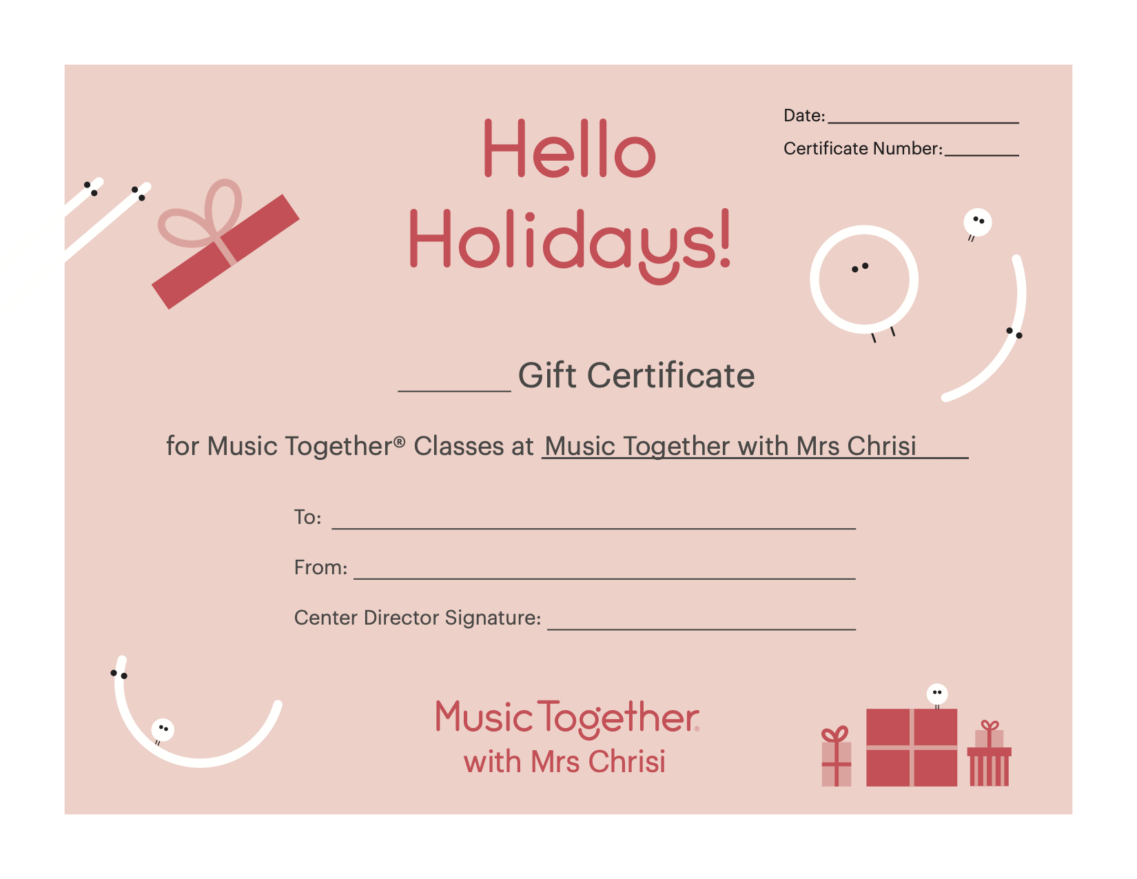 Available in any amount $10 - $500, these can be used for any future class with Music Together with Mrs. Chrisi.